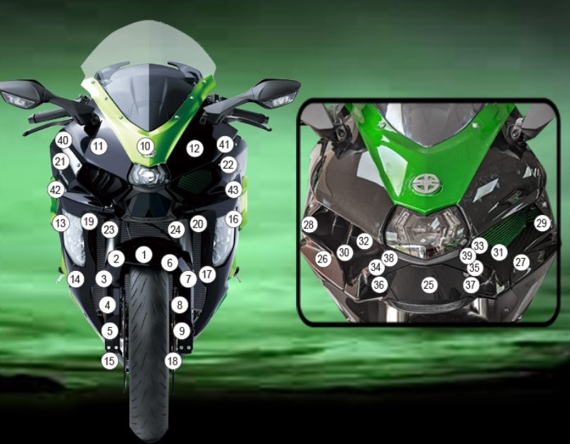 This R&G Second Skin kit contains 43 pieces and is compatible with the Kawasaki H2 SX '22-24.(does not include panniers)
