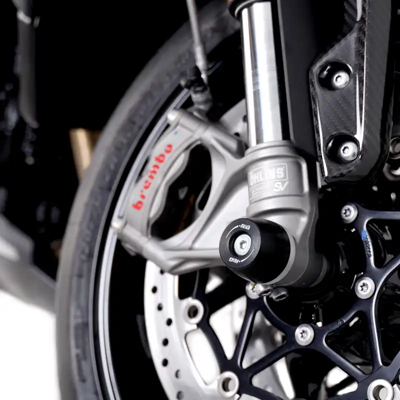 These APEX Fork Protectors are suitable for the Triumph Speed Triple 1200RR '22-, Speed Triple 1200RS '21-, Speed Triple 1200RX '25-, Speed Triple S '11-, Speed Triple RS '18-, Tiger Sport 800 ’25- & Speed Triple R '11-  models, same dependable protection, new tapered-style bobbin.