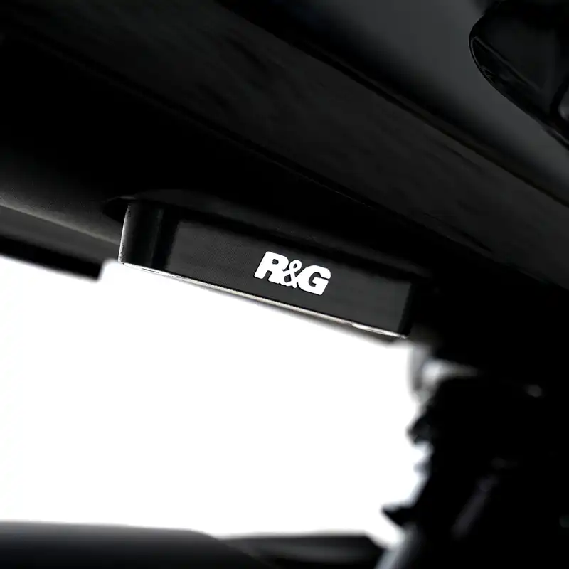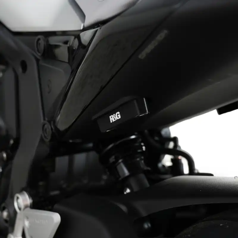 Once you have removed the pillion footrests, fill the void left behind and cover those otherwise exposed holes in the sub-frame with an R&G blanking plate.